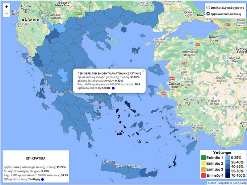 Ειδικότερα, όπως φαίνεται στον συνδυαστικό δείκτη κρουσμάτων κορονοϊού, διαγνωστικών τεστ και δείκτη θετικότητας, όλη πλέον η Ελλάδα βρίσκεται στο «βαθύ κόκκινο».